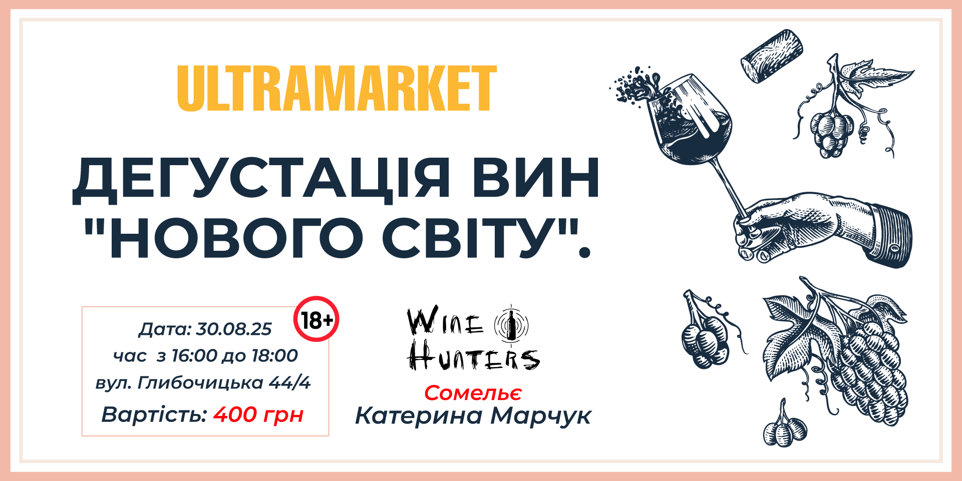 11 жовтня запрошуємо Вас на атмосферну дегустацію «7 відтінків Orange Wine». Разом із ULTRAMARKET та WineHunters поринемо у світ помаранчевого вина — амбітного, багатогранного й по-справжньому особливого. На Вас чекає лекція ...